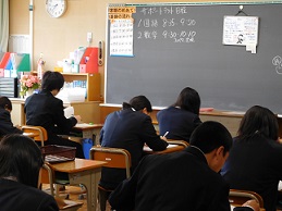 湖東中学校の1日は「湖東タイム」で始まります。8時25分から始まる10分間の読書の時間です。気持ちを落ち着かせ、読書に集中する。とってもいい感じです。どの学級にも静かな心地よい時間が流れています。この写真も、21日(金)に撮影しました。1、2年生の湖東タイムの様子と、3年生のテスト風景です。3年生はたくさんテストがあります。進路実現に向けて、気持ちを集中させて頑張ってほしいです。
