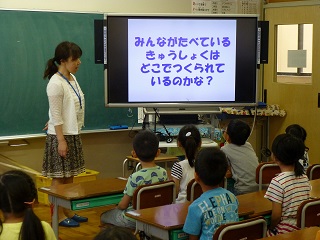 1年生は、栄養教諭の方に給食についてのお話を聞きました。給食ができるまでの様子が