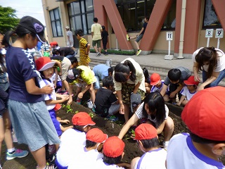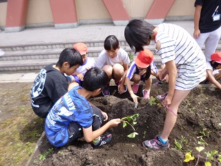 6月8日(水)に6年生と1年生がサツマイモの苗を植えました。6年生の子どもたちが1年生の