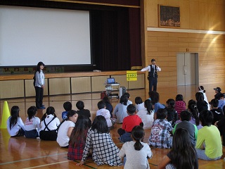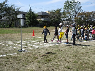 交通安全教室を開催しました。おまわりさんや交通安全協会の方のお話を聞いた後、運動場