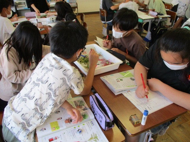 ホウセンカの吸水実験では、自分が育てたホウセンカをカッターで切り、植物のからだの水の通り道について観察しました。