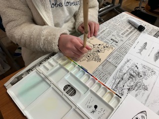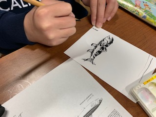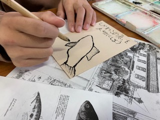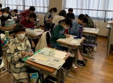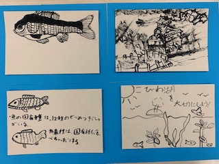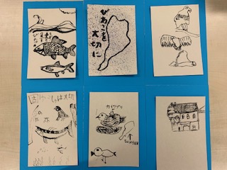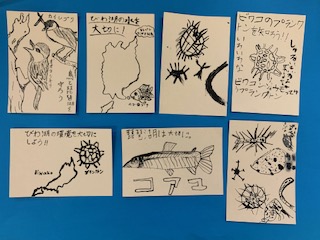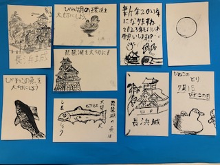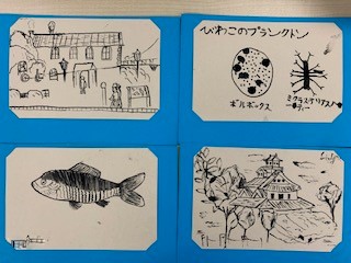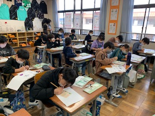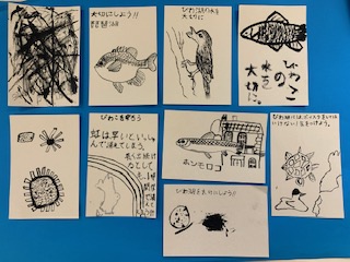 5年生は総合的な学習の時間「びわ湖について調べよう」の学習でヨシペンを使ってヨシ葉書きに調べたことなどをまとめて発信します。びわ湖について学んだことをヨシペンで表現します。