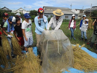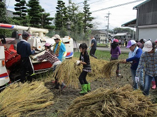 足踏み脱穀機とコンバインで、脱穀体験をしました。水分がまだ残っているので、大きな乾燥機