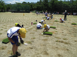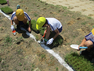 6月29日(月)に、全校で校庭の芝生植え作業に取り組みました。