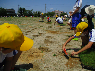 当日の朝には、6年生による芝生の植え方のビデオ放送があり、全校児童も活動がしっかりできるようにお話を聞いていました。作業は、児童一人ひとりが一生懸命取り組んだため、お昼には緑の芝生が広がっていました。