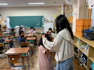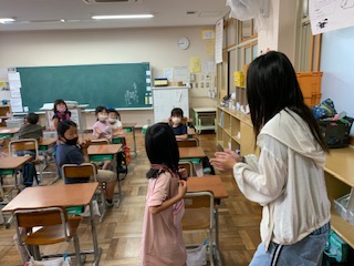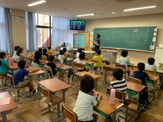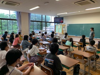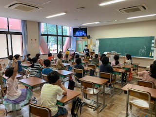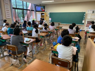 放送を見て盛り上がり、今日のラッキーさんに拍手を送る低学年と中学年。