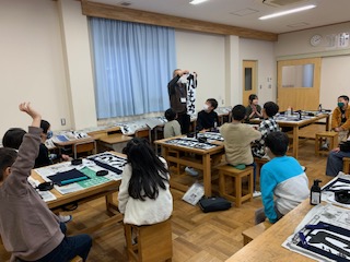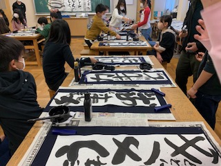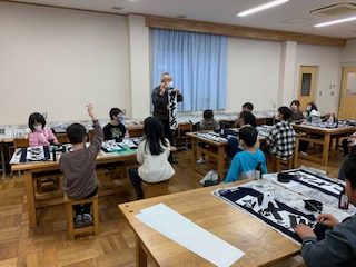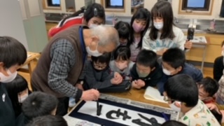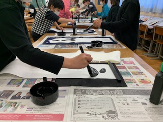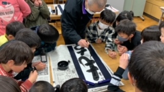 3年生の毛筆習字の学習では、毛筆名人の先生に来校頂き書初めに取り組みました。