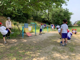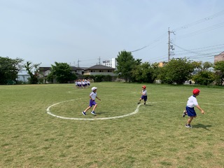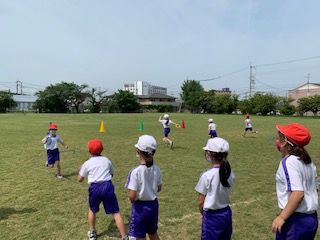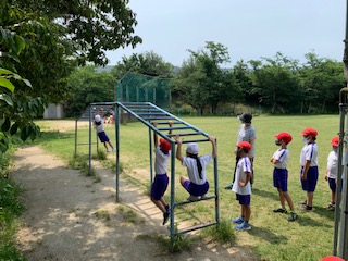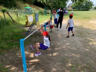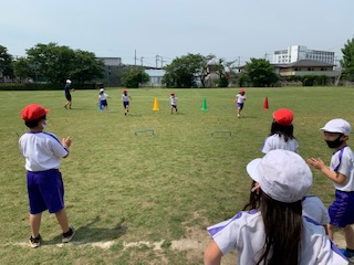 2年生は体育の学習で、折り返しリレー、鉄棒、曲走路走、ドッジボールをしました。芝生の上で元気いっぱいに体を動かし、気分も晴れやかになる2年生でした。