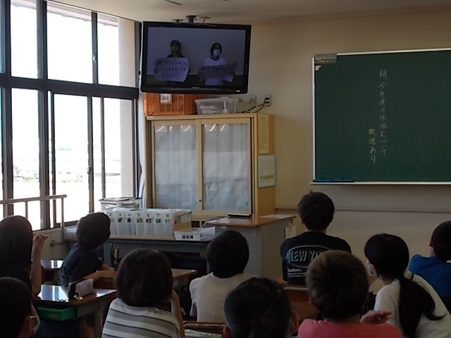明日からの水泳学習に向けて、プール開きをビデオ放送で行いました。