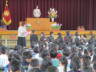 満開の桜のもと、82名の1年生を迎え、全校児童468名で新年度のスタートを切り