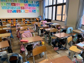 地震が起きたときにまずは自分で「落ちてこない・倒れてこない・移動してこない」場所で安全を確保することが大切です。教室で地震が起きたときに、机の下に入り頭を守る行動ができるように訓練を行いました。繰り返し実施し、動きが身につくようにしていきます。