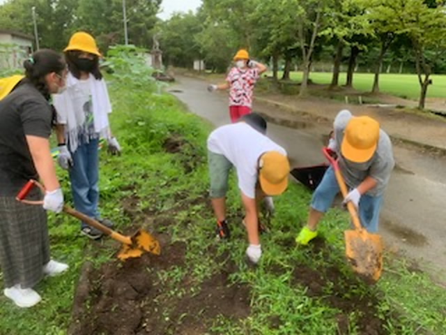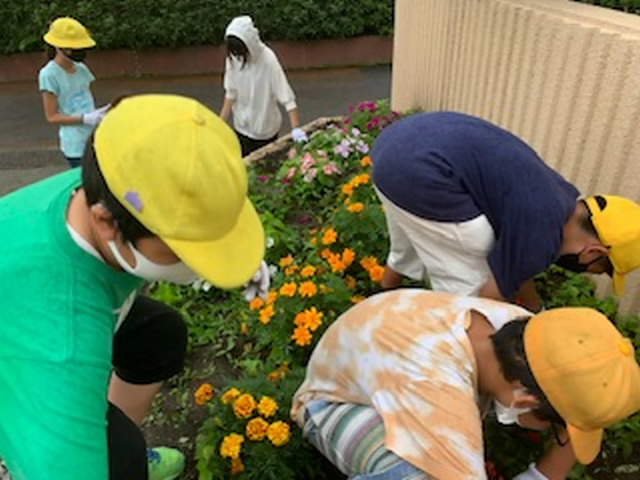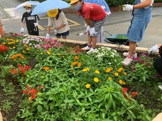 たくさん生えてきた雑草を抜き、花壇の花がよく育つように手入れをしています。
