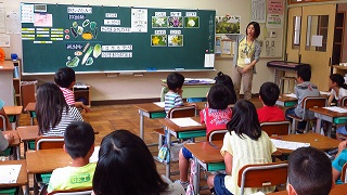 栄養教諭の先生を招いて「やさいのひみつ」について学習しました。野菜の栄養について教えてい