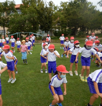体育科の学習では、今年度より芝生化されたグラウンドで、徒競走の練習を始めています。