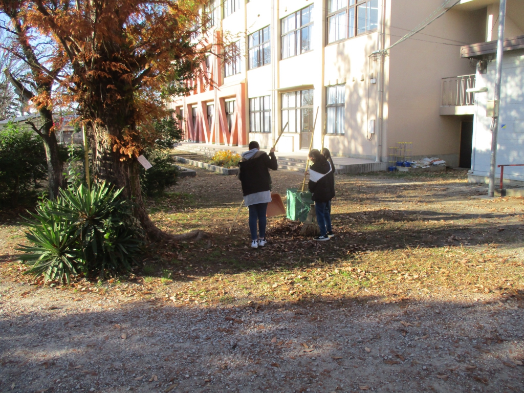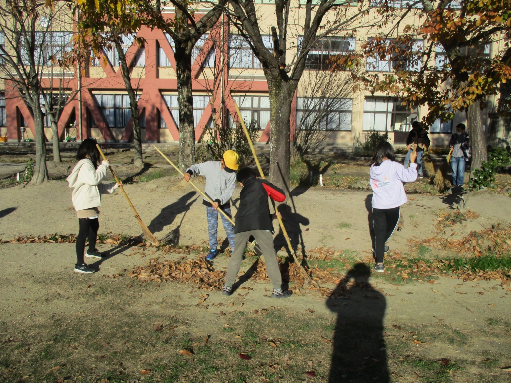 環境美化委員会が校庭の落ち葉拾いを行いました。せせらぎの森の木々は紅葉し、ほとんどの葉が落ち葉となりました。運動場や学級園などに落ちた葉を拾い集めました。学校のみんなのために黙々と仲良く協力して活動する環境美化委員会の子どもたちの姿がほほえましく、大変頼もしく感じました。