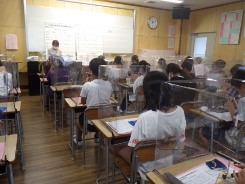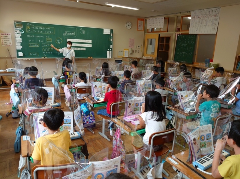 1学期は、音楽の学習においてリコーダーや鍵盤ハーモニカの学習を見合わせていましたが、2学期から飛沫防止ガードを各机に設置して学習を行っています。