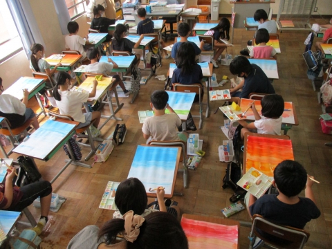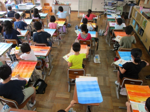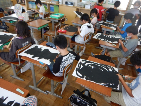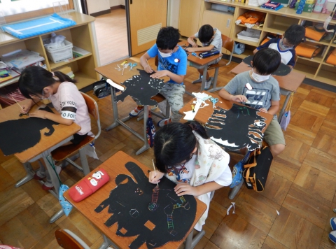 「どんな木にしようかな」「どんな人物が住んでいるのかな」とイメージをふくらませながら取り組んでいます。