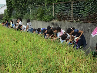 5年生が稲の観察を行いました。5月に植えた稲も大きく育ち稲刈りを待つばかりとなりました。