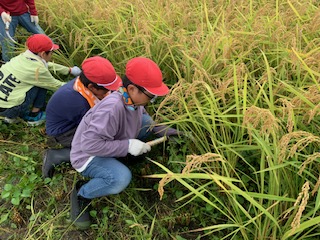 5年生は春に植えた稲の稲刈り体験をしました。鎌を上手に使って稲を刈り取ることができました。