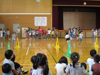 た。縦割りの仲間で力を合わせて走りました。体育館中にみんなの声援が響き渡ってい