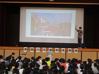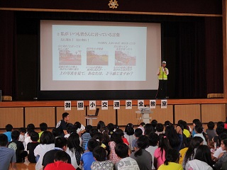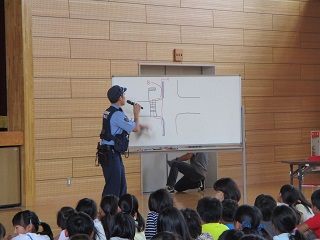 駐在所のおまわりさんと交通アドバイザーの森本さんに来ていただき、全校で交通安全教