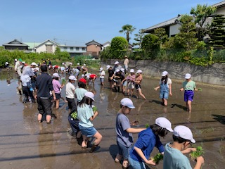 5年生は学習田で田植えを行いました。田んぼに入った瞬間「わあ~」と歓声が上がりました。はじめは、恐るおそる苗をとり植えていた子どもたちも、上手に植えることができました。