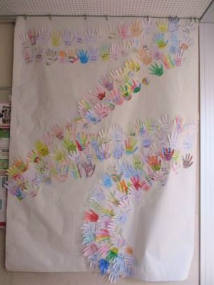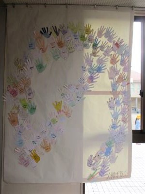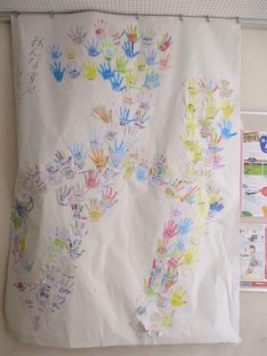 人権委員会では、「みんな幸せ みそのっ子」を合言葉に、どんなふうになれば御園のみんなが学校で居心地よく過ごせるのか、願いを手形に書き表しました。