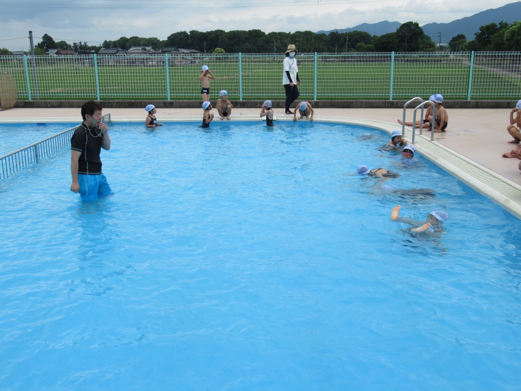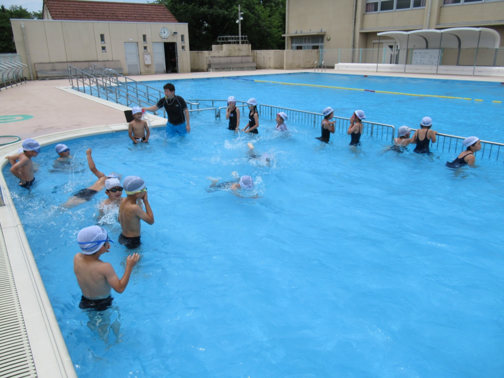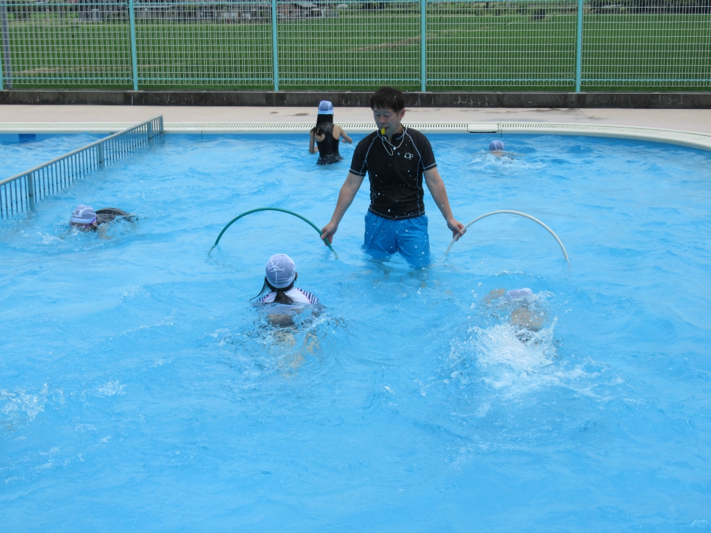2年生は楽しく水泳の学習をしています。水中でフープの輪の中をくぐりぬけたり、サーモンべービーダンスをしたりして、楽しみながら水に慣れられるようにしています。