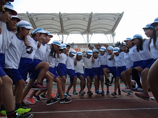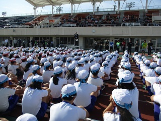 好天のもと、布引スタジアムでの陸上記録会に6年生が参加しました。実行委員が中心と