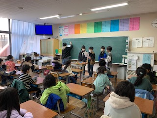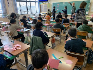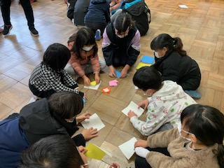 5年生がそれぞれの教室へ行き、下級生に優しく作り方を教えます。