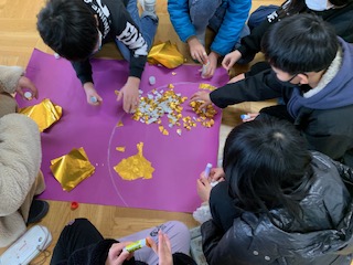 5年生は全校壁面づくりと廊下や階段、6年生の教室のかざりをつくっています。