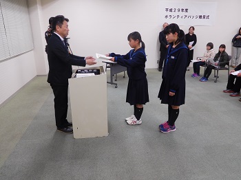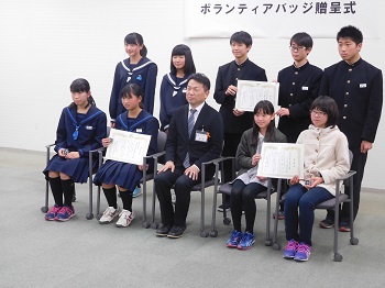 東近江市教育委員会から、本校生徒会中央委員がボランティア活動を表彰され、「ボランティアバッジ」をいただきました。