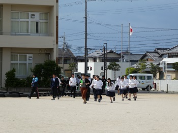 緊急地震速報の音源を聞き、まず教室内で身を守る動きを練習し、その後、グラウンドへ非難しました。