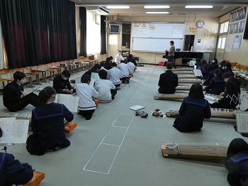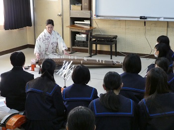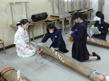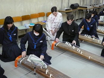 音楽の授業にゲストティーチャーをお招きして、和楽器「筝」の授業を行いました。