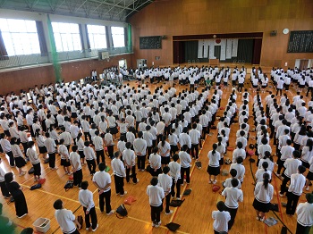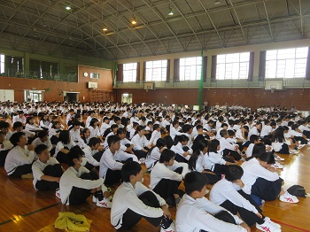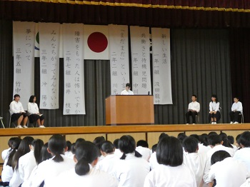 各学年から2名ずつ、計6名の生徒が全校生徒の前で自分の考えを発表しました。何度も作文を書き直し、発表練習もして、本番では大変しっかりした発表をしてくれました。