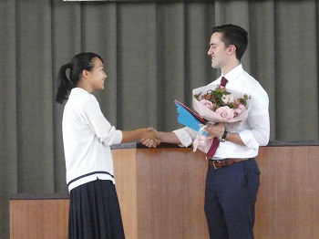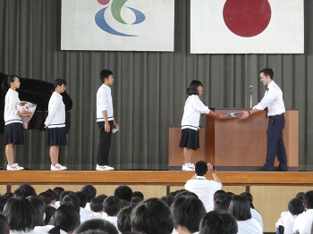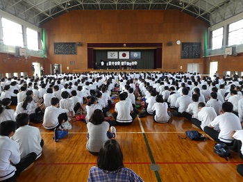 大変暑い日となり、放送での終業式も考えましたが、5年間お世話になったALTのザック先生の送別式も計画されていたため、給水タイムを設けながら体育館で実施しました。