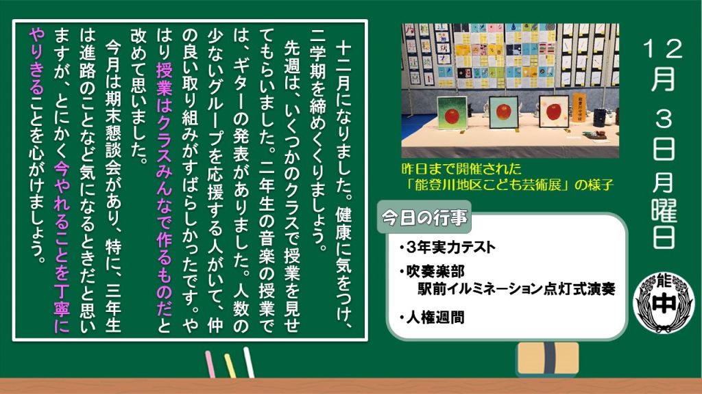 |   | |  | | 日誌| 2018/12/05 | 12月3日(月) |  | by 校長 |