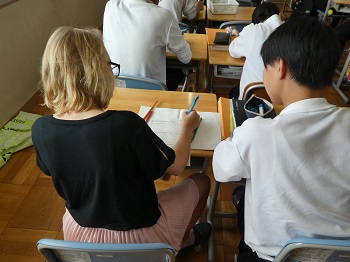 7月10日から2日間、カナダのテーバー町の親善使節団員3名が、能登川中学校で学校体験をしました。わからない日本語の授業を丸2日、がんばって受けていました。でも、ALTの力を借りて、「めあて」や指示を英語で示していた授業もありました。楽しんでもらえたでしょうか。