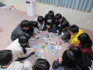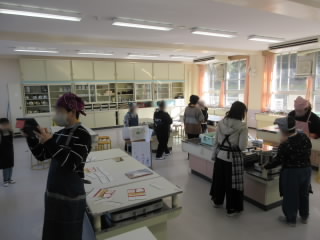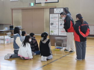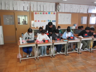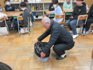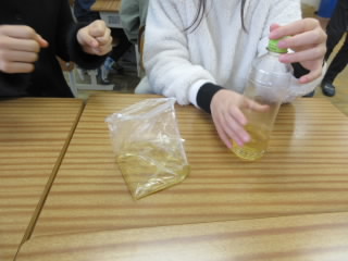 市辺コミュニティセンターの方に来ていただき減災について学びました。まず初めに「減災かるた」をしました。災害の時に気を付けること、普段から意識しておくことなどが書かれた札を取っていきました。次は災害時に困るトイレについて学びました。水が出ない、水は出るが下水道管が破損し水を流せないときのトイレの処理の方法について、お茶を尿に見立て凝固剤で固めて処理をする方法を実際に試してみました。万が一の場合に備えてイメージしておくことの大切さを学びました。