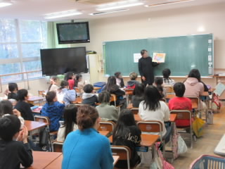毎朝朝の会が始まる前に読書を行っていますが、今年度初めて読書ボランティアさんに来ていただき読み聞かせをしていただきました。