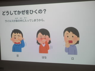 身体測定の時間をつかい保健指導を行いました。テーマは「感染症から身を守るために」です。感染には「飛沫感染」「空気感染」「接触感染」があり、鼻、口、目などからウイルスが体内に入ることを確認し、そのうちの一つである「接触感染」について実験をしました。6人ずつの列の先頭の児童に、汚れがあると反応するジェルを塗り、伝言ゲームのように後ろの人と握手をして何番目の人まで汚れが移るかというものです。移った汚れの範囲には差がありましたが一番後ろの児童まで汚れが移っていることをブラックライトを照らすことで確認しました。手洗いの大切さについて再認識することができました。