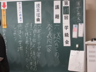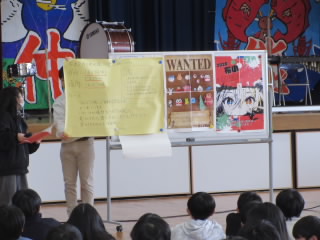 キラリ運営委員長から、児童集会で何をしていくかやスローガンの発表のあと、各委員会の委員長が、委員会の仕事内容についての紹介がありました。