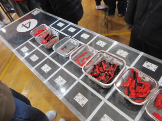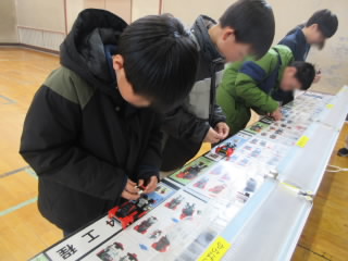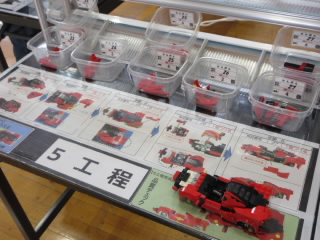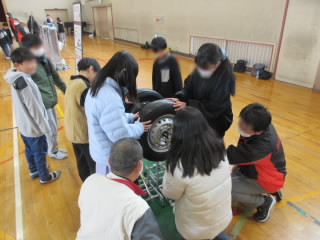 ダイハツ工業さんに来ていただき、ものづくり体験をさせていただきました。子どもたちは事前の学習で自動車ができるまでの工程を映像で確認していますが、体育館に準備していただいた模型や道具を使って、タイヤの取り付け、塗装、流れ作業による部品の取り付け体験を行いました。