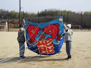 総合的な学習の時間「伝統の思いを受け継ごう」の一環として、大凧づくりに取り組み、布引総合公園グラウンドで凧あげを行いました。