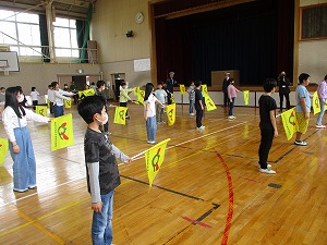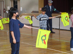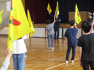 登校班の新班長を対象に、警察署からおまわりさんに来ていただいて登校班旗の使い方について教えていただきました。横断歩道などでは、まず班の子らを班旗でとどめておいて道路の安全確認をする。次に、車が完全に停止してのを確認してから、右左右を確認して班員を渡す。通過したあと、ドライバーさんにお礼をする。など、基本的なことを、その意味を解説しながら教えていただきました。班長の子らも、班のメンバーの安全を守る役割を、改めて噛みしめていたようでした。