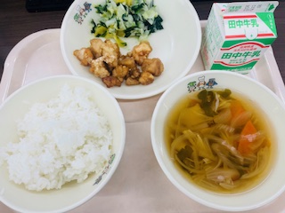 ご飯、牛乳、豚肉の竜田揚げ、大豆の磯煮、すまし汁