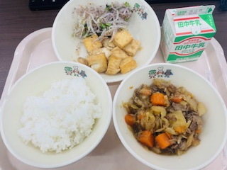 ご飯、牛乳、厚揚げのおろしかけ、ツナ和え、鶏じゃが