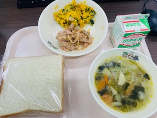 コッペパン、牛乳、オムレツ、ブロッコリーサラダ、ミネストローネ