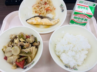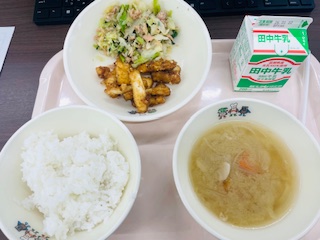 ご飯、牛乳、たらのから揚げ、きんぴらごぼう、玉ねぎのみそ汁