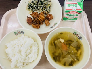ご飯 牛乳 豚肉の竜田揚げ しそひじき和え かみなり汁